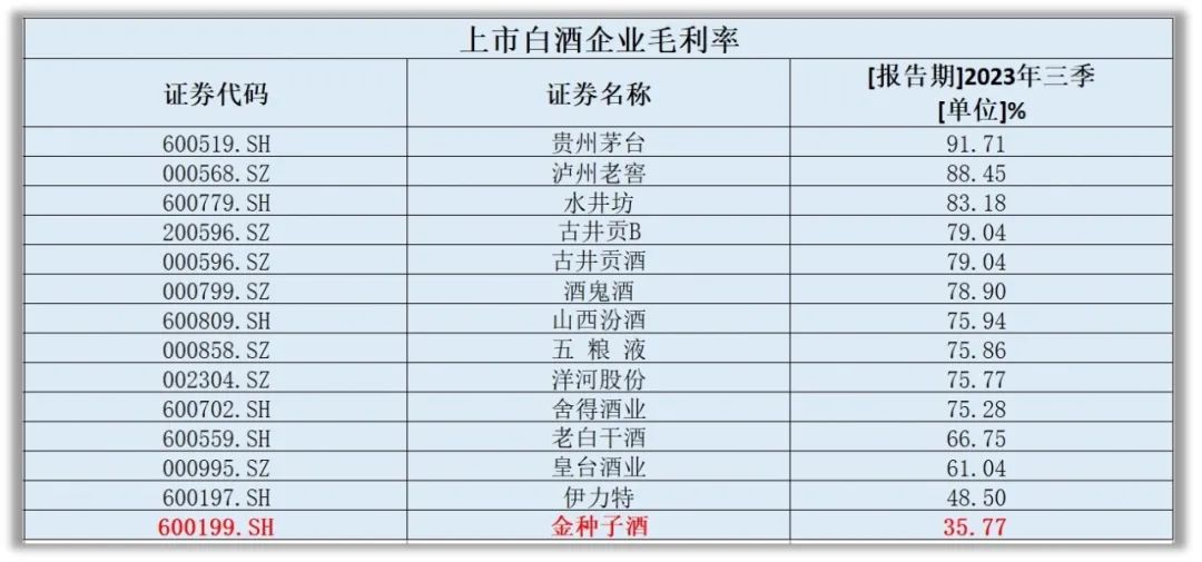 财报显示,2023前三季度,金种子酒高端酒、中端酒、低端酒分别实现收入0.15亿元、0.54亿元、1.35亿元,分别占酒类业务比重 7.16%/26.69%/66.15%。其中高端酒环比增长78.30%;中、低端酒分别下滑15.12%、5.39%,到2023年三季度末,金种子酒的毛利率仅35.77%,在白酒上市公司中排名垫底。而且,落后于倒数第二的伊力特13个百分点,落后倒数第二的皇台酒业近25个百分点以上。