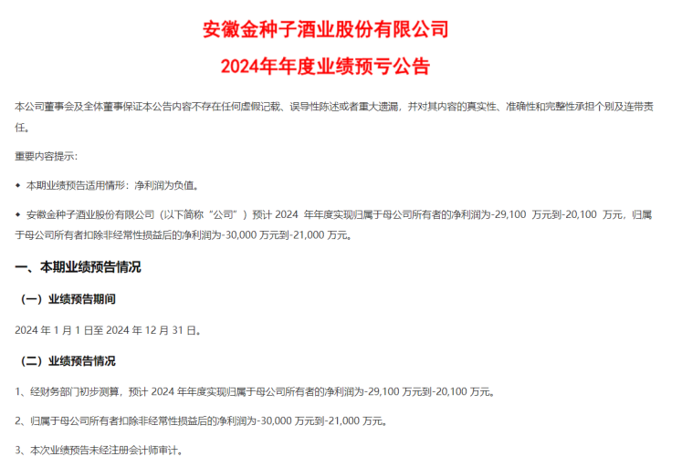金种子酒作为安徽白酒行业的“四朵金花”之一,近年来却陷入了持续亏损的困境。2024年1月16日,金种子酒发布了业绩预亏公告,预计2024年将出现2.91亿元至2.01亿元的巨额亏损。
