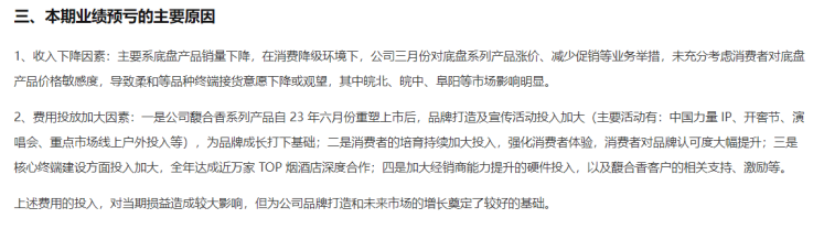 公告显示,收入下降主要系底盘产品销量下降,在消费降级环境下,公司三月份对底盘系列产品涨价、减少促销等业务举措,未充分考虑消费者对底盘产品价格敏感度,导致柔和等品种终端接货意愿下降或观望,其中皖北、皖中、阜阳等市场影响明显。