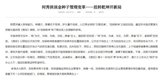 2022年9月,金种子酒官方网站发布了一篇题为《何秀侠谈金种子管理变革——扭转乾坤开新局》的文章。