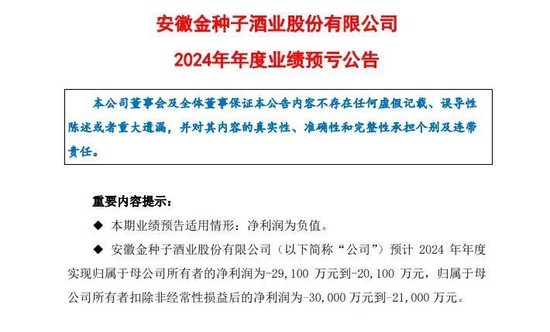 2025年1月17日,金种子酒发布公告,预计2024年年度实现净利润为-2.01亿元到-2.91亿元,扣非净利润为-2.1亿元到-3亿元。
