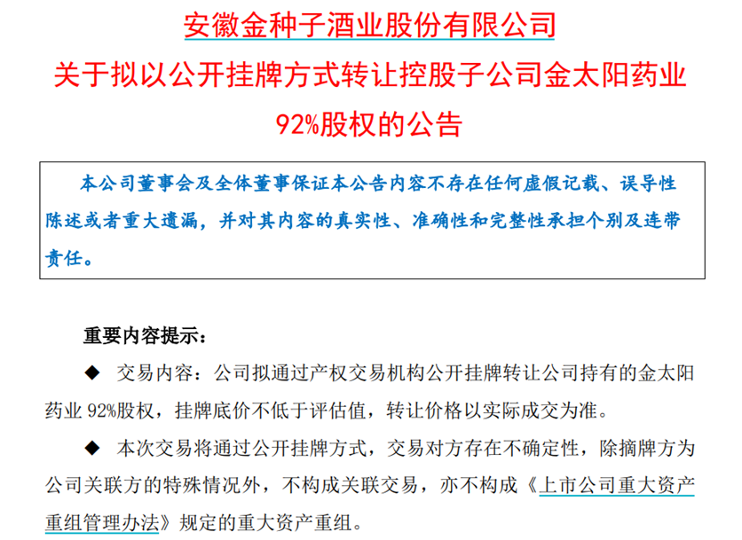 除了卖地,金种子酒也在剥离药业业务。2024年4月30日,金种子酒发布公告称拟公开转让子公司金太阳药业92%股权。金太阳原来是金种子酒旗下的药业板块,负责药品生产销售, 2023年该部分收入为4.17亿元,占比总营收达28.39%。