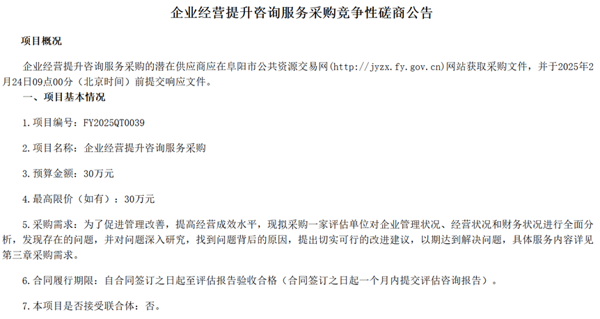 2月11日下午,在阜阳市公共资源交易中心,安徽金种子酒集团有限公司发布了一则关于采购企业经营提升咨询服务的竞争性磋商公告。