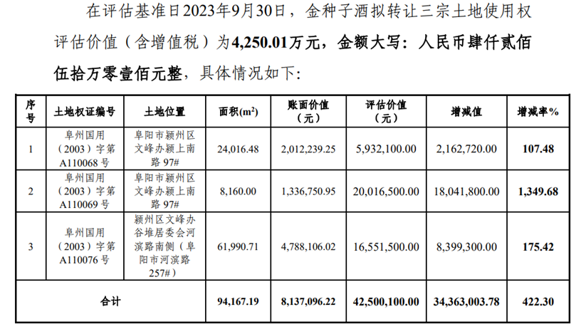 2023年12月11日,金种子发布公告,宣布为解决房、地产权分离等历史遗留问题,减少关联交易,提高上市公司整体运营质量,公司拟将三宗土地的使用权转让给控股股东金种子集团。在相关的资产评估报告中,公司披露拟转让使用权的三宗土地的总面积合计9.42万平方米,评估价值为4250.01万元。这笔交易在2024年4月30日的公告中宣布完成。