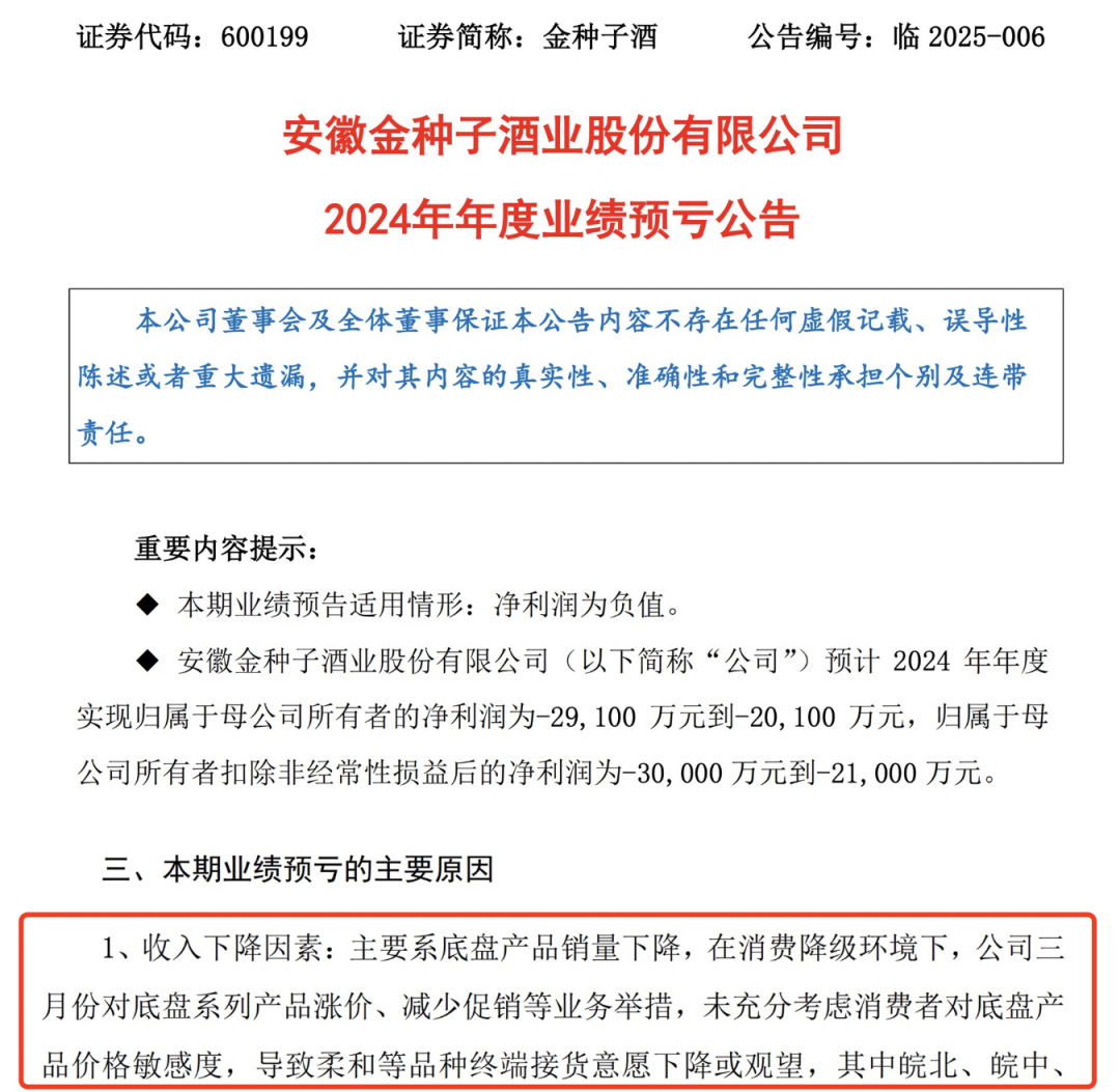 酒讯注意到,对于2024年业绩预亏原因,金种子酒在公告中指出,公司三月份对底盘系列产品涨价、减少促销等业务举措,未充分考虑消费者对底盘产品价格敏感度,导致柔和等品种终端接货意愿下降或观望。另外,费用投放加大也对当期损益造成较大影响。