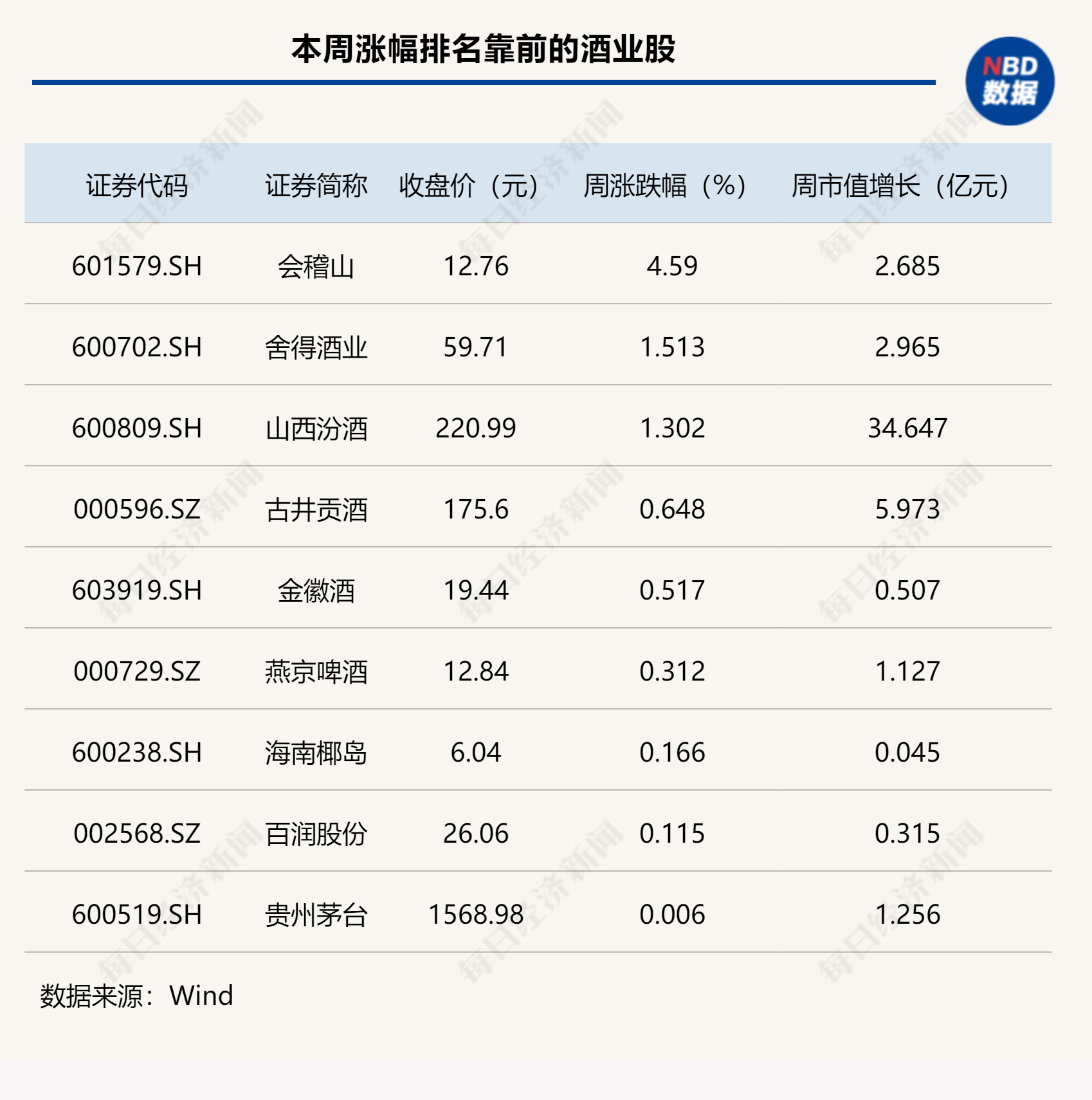 在非白酒行业中,会稽山本周涨幅达到4.59%,表现较强,而兰州黄河、百威亚太周跌幅分别达6.51%和6.81%,股价表现低迷。