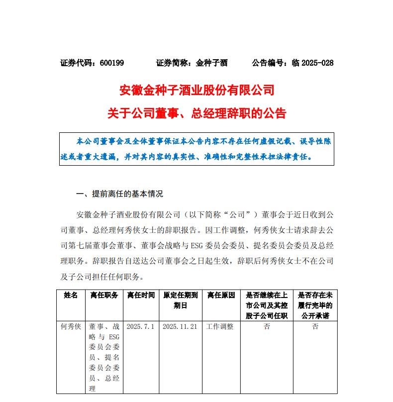 自2022年华润入主以来,“华润系”高管便接手金种子酒经营管理工作。被委以重任的何秀侠,原定任期是到今年11月21日,此番为其提前离职。
