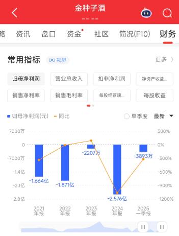但进入2025年,金种子酒业绩进一步恶化。今年一季度,公司营业收入同比下滑29.41%至2.96亿元,净利润亏损扩大至3893万元。