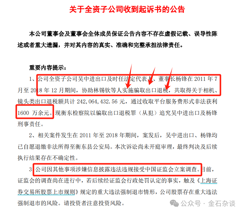 3月7日,江苏吴中公告称,子公司江苏进出口及其时任董事长杨锋涉多年前协助骗税2.42亿元被起诉,非法牟利1600万。江苏吴中表示,相关案件发生在2011年至2018年期间。巧合的是,就在2018年7月,江苏进出口法人、负责人将杨峰更换为骆啸。