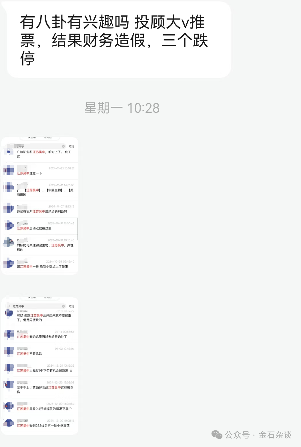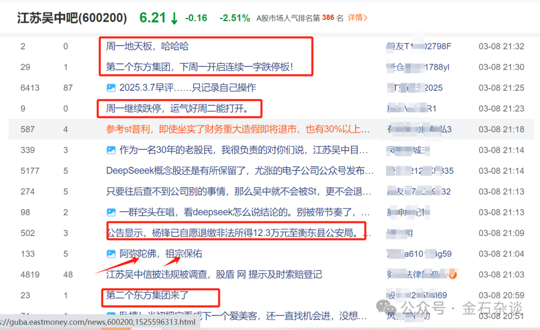 不过,仍有股民抱有侥幸:周一地天;只要往后查不到江苏吴中别的事情,公司就不会st;即便st,即使坐实了财务重大造假即将退市,也有30%以上的反弹。对此,金石杂谈只有一句话:有机会跑就赶紧跑,否则只有沦为被收割的命运,这类股中博弈无异于飞蛾扑火。