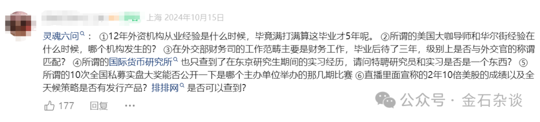 公开资料显示,这位知名投顾大V,曾经在外交部财务司、私募有过工作经历,号称美国大咖导师,拥有华尔街经验,且宣称的2年10倍美股的成绩。不过,去年10月就被某财经博主打假,对此她还发出了灵魂六问。