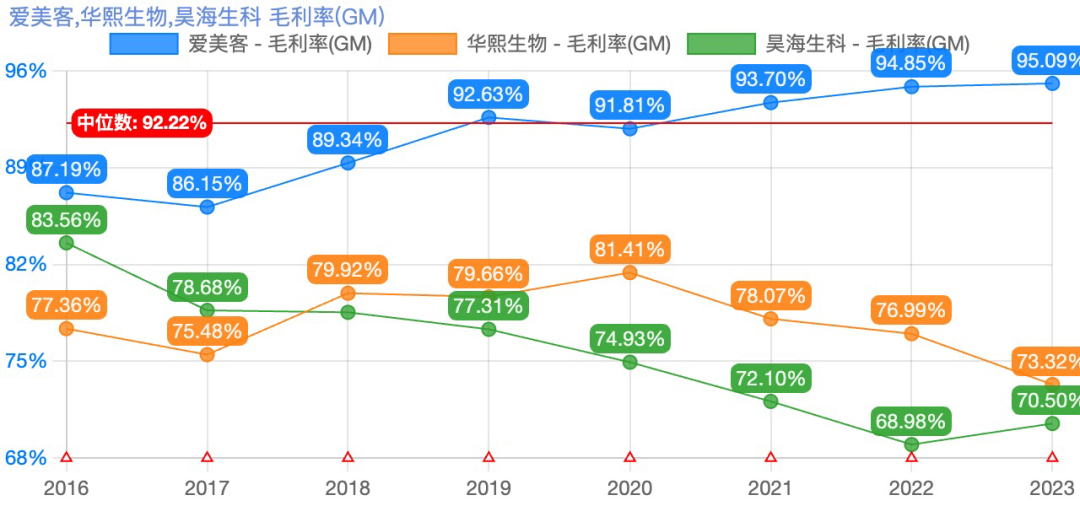 结合下图数据,与同行业华熙生物,昊海生科近些年来整体波动下滑的毛利率水平对比来看,爱美客从上市以来毛利率水平稳步上升,从2016年的87.19%上升至2023年的95.09%,甚至比竞争对手70%左右的毛利率水平高出将近20个点。