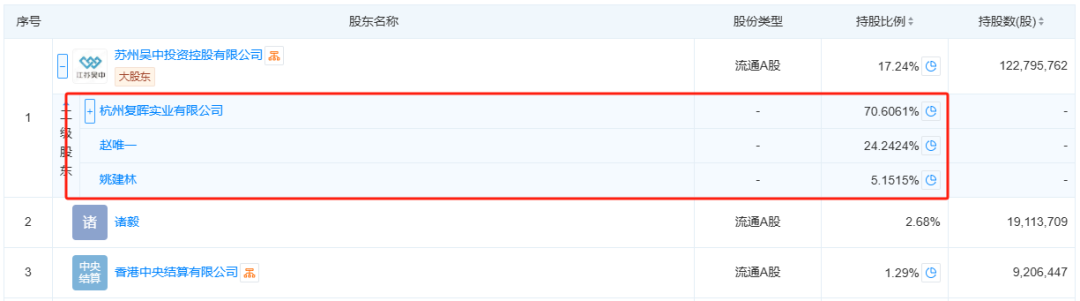 到了2019年8月,姚建林将所持吴中控股10%股权转让予复晖实业。此次交易完成后,吴中控股股权结构调整为:复晖实业持股70.61%,赵唯一持股24.24%,姚建林持股5.15%,控股股东层面的股权重组正式尘埃落定。