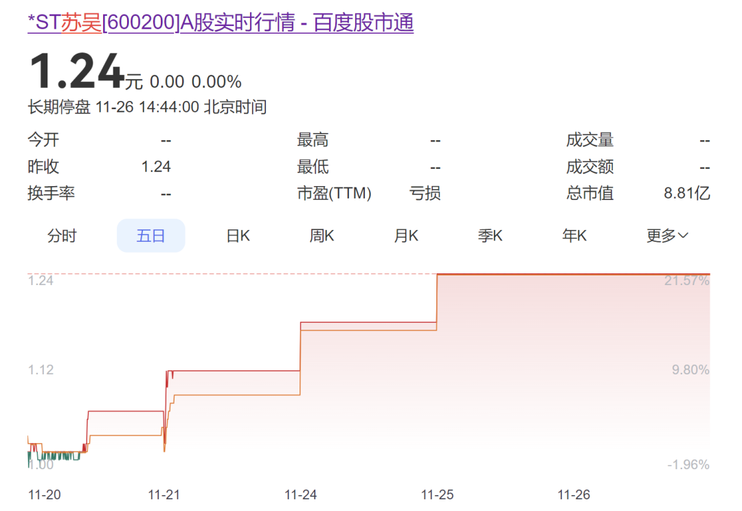 值得注意的是,从11月19日至11月25日,这只带星ST股连续收获五个涨停板,股价从1.02元/股攀升至1.24元/股,暂时避免了“面值退市”的风险,吸引大批散户追高。