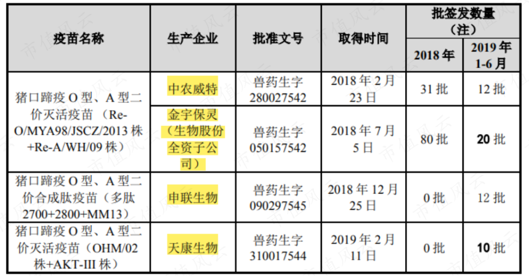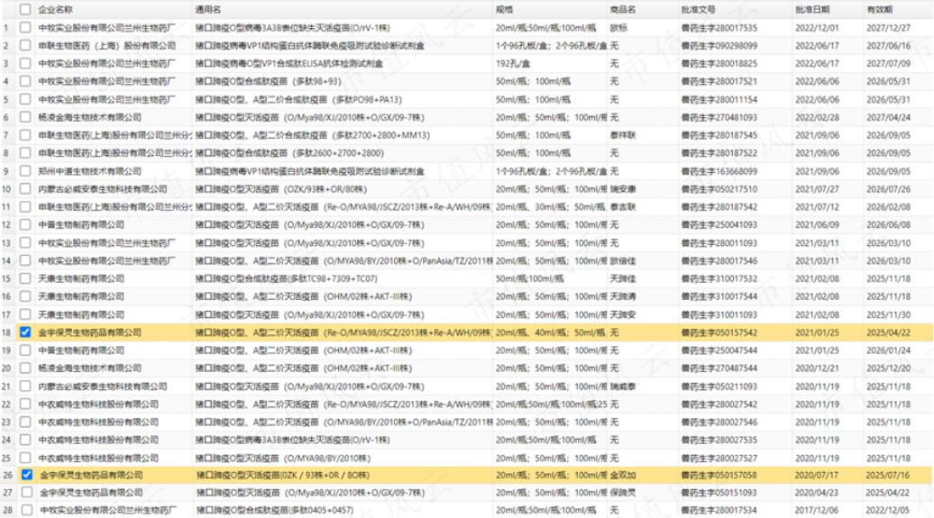 国家兽药基础数据库显示,猪口蹄疫产品目前拿到批文在售的至少28种,而且都是近一两年批准的。