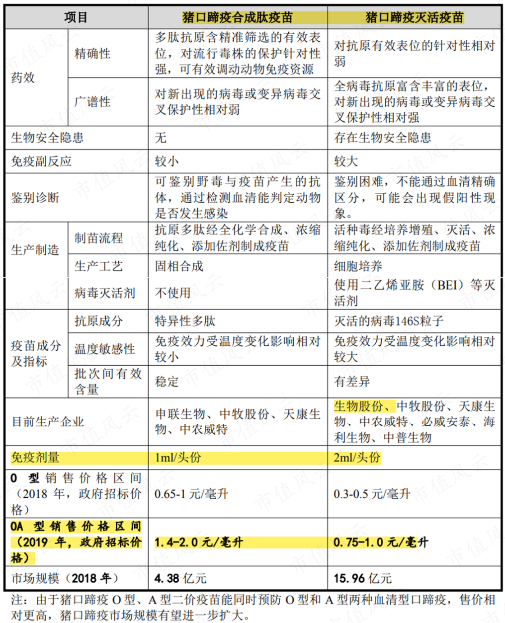 而当前,猪口蹄疫疫苗技术上主要还是合成肽与灭活两种,彼此各有千秋: