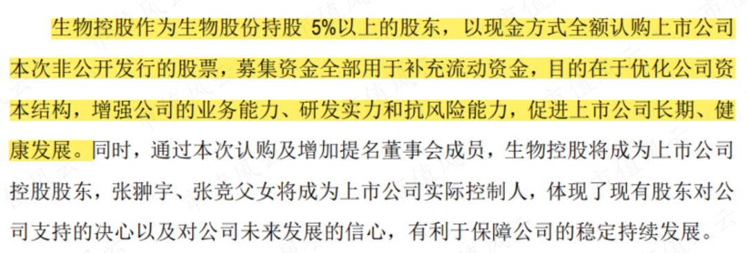 其实,不管表面上谁出,最后的诉求都是拿到廉价筹码并且在二级市场变现。公司表示此前不存在实控人,而经过这轮融资,张翀宇、张竞以及父女二人控制的生物控股将合计持有的公司股份从13.23%提升到20.11%,二人也将成为公司实际控制人。