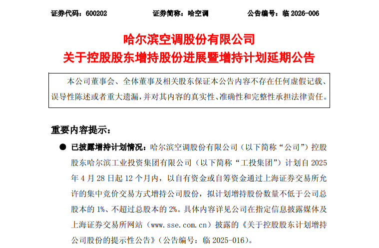 哈空调3月24日晚间宣布,公司于近日收到哈工投集团团函告,其拟将原增持计划实施期限延长6个月至2026年10月27日,增持计划其他内容不变。本次增持计划延期事项尚需提交公司股东会审议。