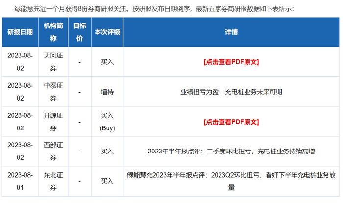 部分投资者甚至将怒火对准了券商。原因是,绿能慧充近一个月获得8份券商研报关注。天风证券、西部证券、中泰证券等认为,绿能慧充2023Q2环比扭亏,看好下半年充电桩业务放量。因此,对绿能慧充给予增持或买入评级。