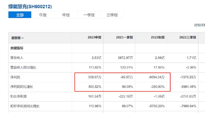 绿能慧充的财报显示,2018年到2022年,其业绩其实并不好,除了2020年净利润实现盈利外,其余年份都是亏损。2022年,其净利润更是亏损了9654万元。不过,2023年一季度开始,其净利润同比明显开始回升。截至中报,绿能慧充的净利润为359.67万元,同比大增500%成功扭亏为盈。