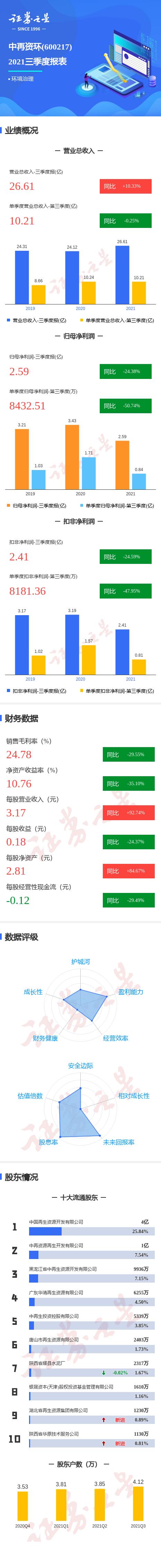 中再资环2021三季报显示,公司主营收入26.62亿元,同比上升10.33%;归母净利润2.6亿元,同比下降24.38%;扣非净利润2.41亿元,同比下降24.59%;其中2021年第三季度,公司单季度主营收入10.22亿元,同比下降0.25%;单季度归母净利润8432.51万元,同比下降50.74%;单季度扣非净利润8181.37万元,同比下降47.95%;负债率67.7%,投资收益76.58万元,财务费用1.21亿元,毛利率24.78%。
