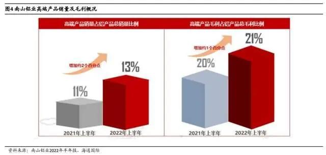 高端产品的销量约占公司铝产品总销量的 13%,同比 2021 年增长约 2 个百分点;高端产品毛利约占公司铝产品总毛利的 21%,同比 2021 年增长约 1 个百分点。