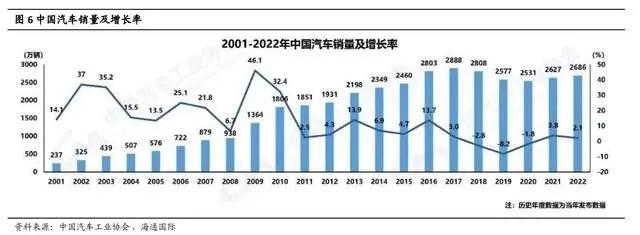 据中国汽车工业协会,2022 年汽车产销分别完成 2702.1 万辆和 2686.4 万辆,同比分别增长 3.4%和 2.1%,较上年产量增速持平,销量增速下降 1.7%。