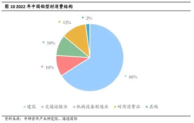 铝土矿全球储量丰富,主要集中在靠近赤道的国家,包括澳大利亚、几内亚、巴西、越南和牙买加等地,合计储量占全球 64%。我国的储量仅占全球的 3%,但分布高度集中,广西、河南、山西和贵州四省合计占比已达 90%以上。产业链中游为铝加工产品的生产,产品包括铝型材和铝板带箔。产业链下游为铝加工制品的应用,涉及领域包括建筑装饰、包装容器、航空航天、交通运输等。
