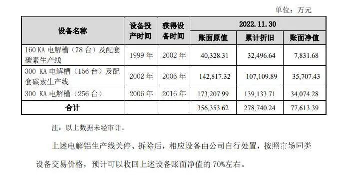 同时,33.6万吨电解铝产能指标对应的电解铝生产线拟关停、拆除,具体包括78台160KA预焙电解槽(核定产能3.6万吨/年)和412台300KA预焙电解槽(核定产能30万吨/年)及部分配套碳素生产线,相应设备由公司自行处置。