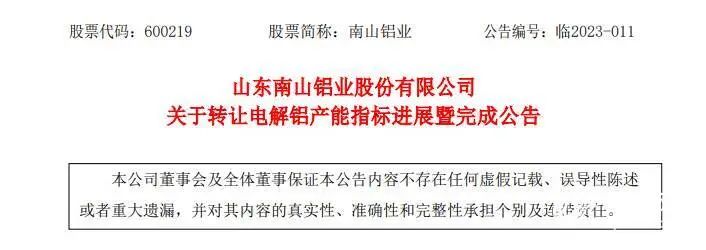 记者注意到,2022年12月南山铝业曾发布一条关于拟转让电解铝产能指标的公告。彼时南山铝业提出,为调整、优化产业布局和资产结构,顺应国家产业政策发展,拟对外转让33.6万吨电解铝产能指标。