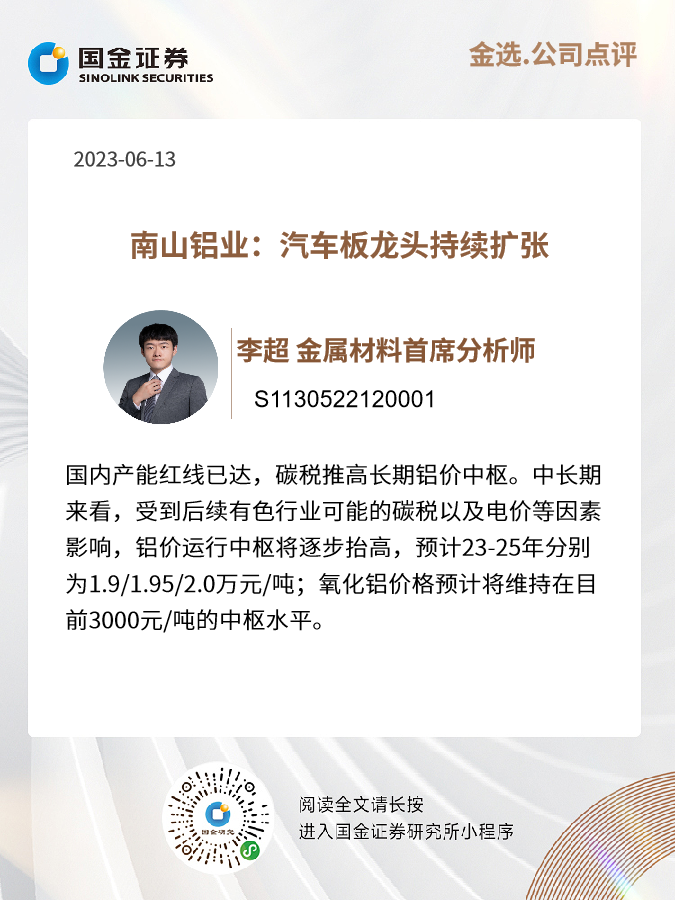 国内汽车板龙头产能持续扩张。公司汽车板在产产能20万吨,我们预计在建的20万吨产能将于24年年底逐步释放,进而匹配新能源汽车市场快速增长的需求。后续还将及时跟进客户需求及市场情况推进原有包装生产线转产,进一步巩固公司国内汽车轻量化铝板龙头企业地位。