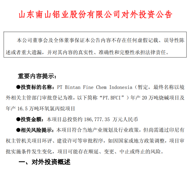 南山铝业(600219.SH)公告称,公司拟通过境外全资公司与非关联公司共同在BVI设立路径公司,并由BVI公司设立香港子公司,与PTSUNINVESTAMA在印尼合资成立公司PTBintanFineChemIndonesia,用于投资建设年产20万吨烧碱及年产16.5万吨环氧氯丙烷项目,投资金额约18.68亿元人民币。本项目符合当地产业规划及行业政策,但尚需通过印尼有权主管机关项目环评、建设许可等审批程序,如因国家或地方政策调整,项目审批实施条件发生变化,项目可能存在顺延、变更、中止或终止的风险。