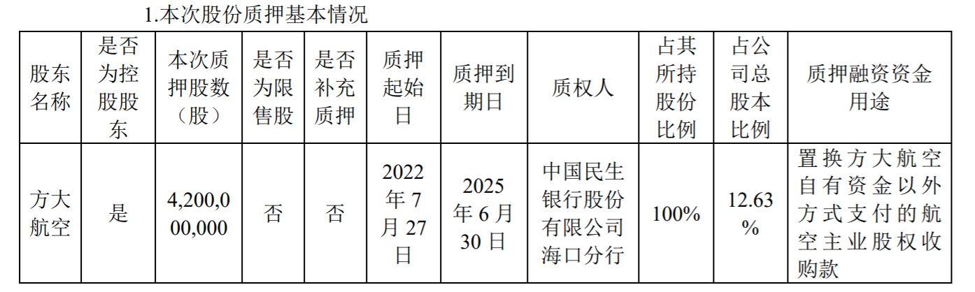 民航资源网2022年7月28日消息:ST海航发布公告,海南航空控股股份有限公司(以下简称“公司”)控股股东海南方大航空发展有限公司(以下简称“方大航空”)直接持有公司股份4,200,000,000股,占公司总股本的12.63%。方大航空及其一致行动人累计质押股份数量(含本次质押)占其持股数量比例为91.78%。