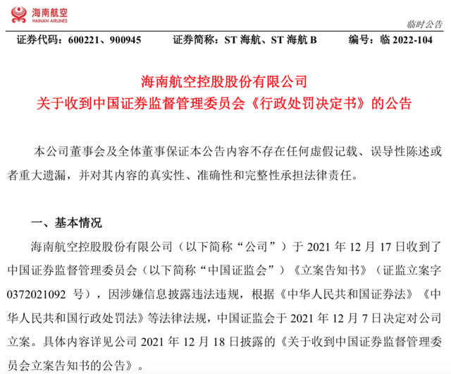 日前,海南航空控股股份有限公司(以下简称海航控股或公司)发布公告称公司收到中国证监会《行政处罚决定书》(〔2022〕46号)。中国证监会查明:海航集团有限公司(以下简称海航集团)通过“海航集团-事业部/产业集团-单体公司”三层管理结构实际管理下属公司。在财务上施行全集团一体化、垂直化、三层式控制及管理;在资金上施行现金流一体化管理,资金由海航集团统一调拨。海航控股属于前述“单体公司”,在财务资金管控方面缺乏独立性,其与相关关联方的资金往来、签署对外担保合同等,均在海航集团组织及操控下完成。由此导致海航控股未按规定披露非经营性关联交易和关联担保。据此,中国证监会决定对海航控股给予警告,并处以200万元罚款。