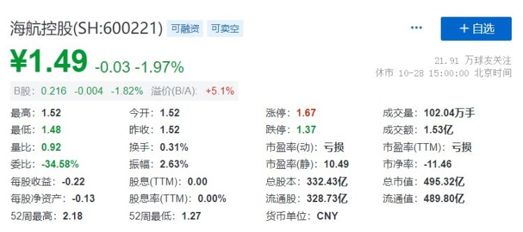 截至10月28日,海航控股收跌1.97%,报1.49元/股,总市值为495亿元。