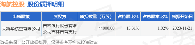证券之星消息,海航控股(600221)11月23日公开信息显示,股东大新华航空有限公司向吉林银行股份有限公司吉林吉营支行合计质押4.4亿股,占总股本1.02%。质押详情见下表: