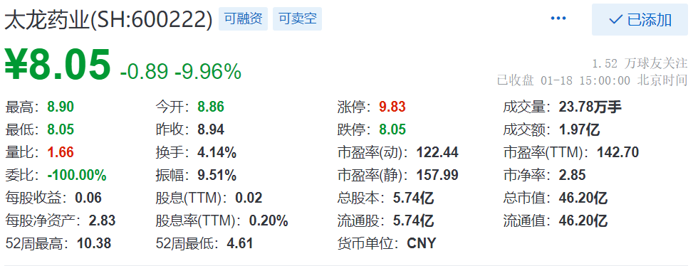 1月18日,截至收盘,太龙药业(SH:600222)跌停,下跌9.96%,现报8.05元;成交额为1.97亿元,总市值为46.20亿元。