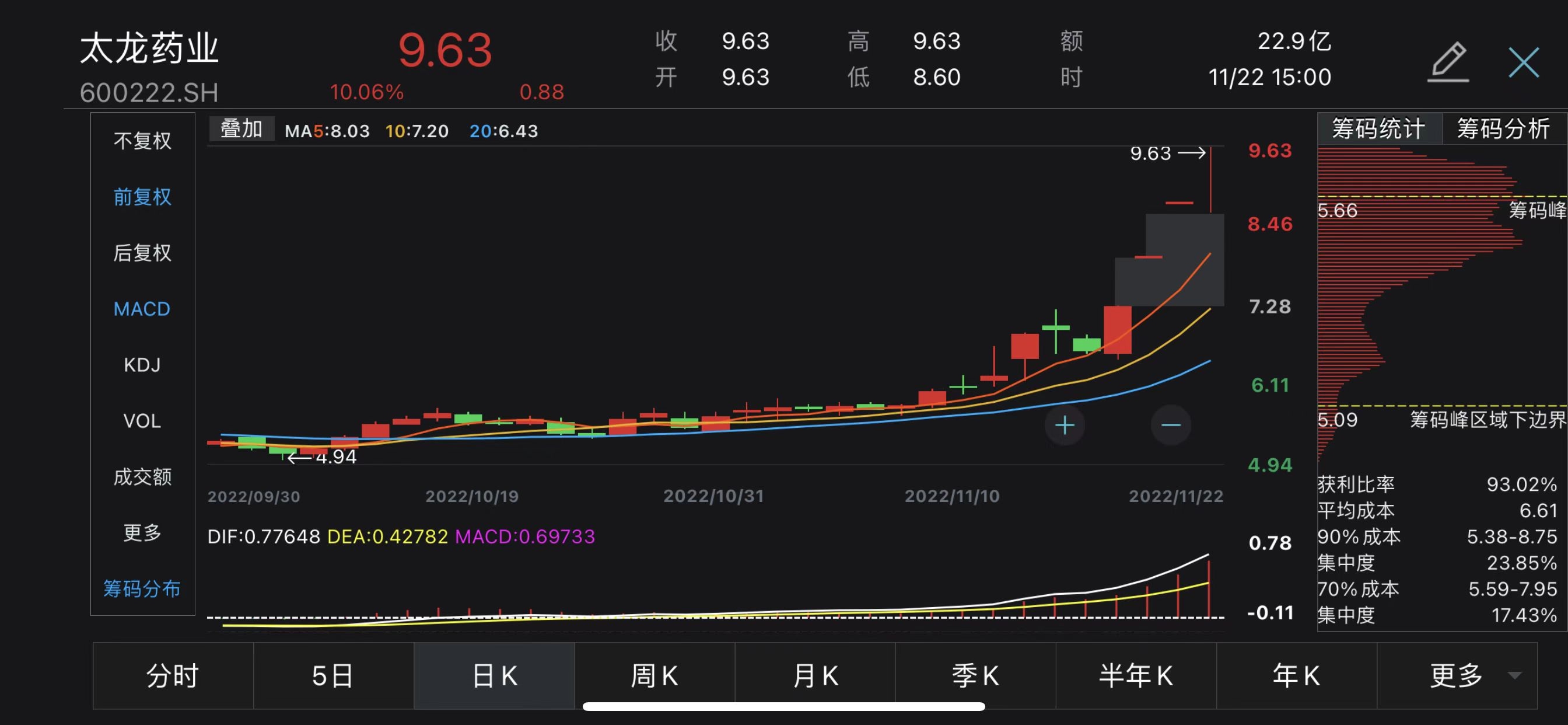 Wind数据显示,11月22日早盘,太龙药业几度触及涨停,盘中探底回升短暂翻绿,尾盘再度拉升涨停,22日收报9.63元,创2021年9月以来新高。