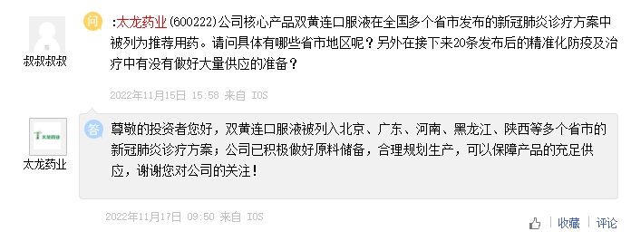 结合市场信息,太龙药业股价异动或受新冠药、供销社两个热点概念影响。11月17日,太龙药业通过上证·e互动平台回答投资者提问称,双黄连口服液被列入北京、广东、河南、黑龙江、陕西等多个省市的新冠肺炎诊疗方案;公司已积极做好原料储备,合理规划生产,可以保障产品的充足供应。