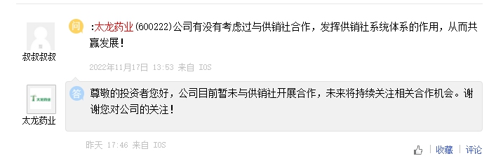 11月21日,太龙药业回答投资者提问称,公司目前暂未与供销社开展合作,未来将持续关注相关合作机会。