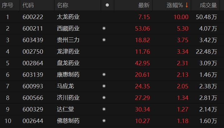 11月7日,中药股拉升,截至10时09分,太龙药业涨停,西藏药业、龙津药业、盘龙药业等跟涨。