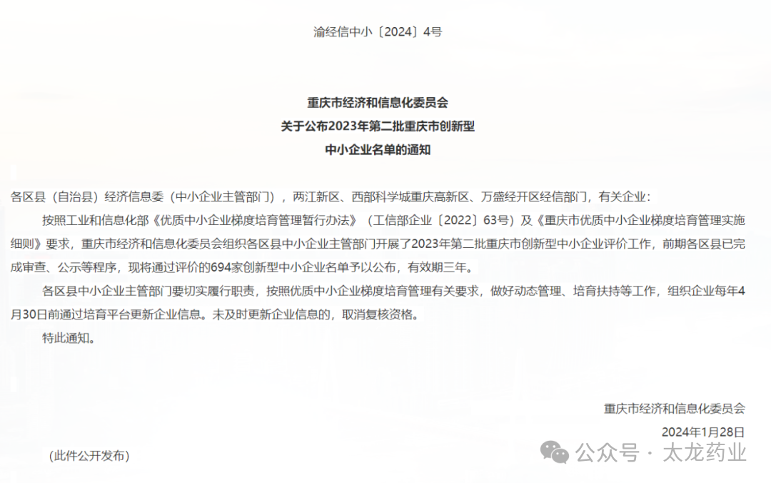 按照工业和信息化部《优质中小企业梯度培育管理暂行办法》(工信部企业〔2022〕63号)及《重庆市优质中小企业梯度培育管理实施细则》要求,重庆市经济和信息化委员会组织各区县中小企业主管部门开展了2023年第二批重庆市创新型中小企业评价工作,经过严格的审查、公示等程序,太龙药业子公司北京新领先医药科技旗下新领先(重庆)医药科技有限公司成功获评“重庆市创新型中小企业”。