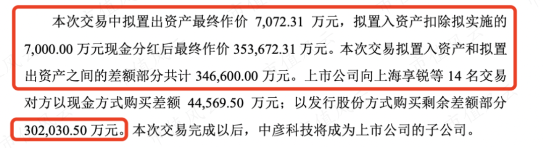 资产置换前中彦科技分红7000万,再抵掉与ST昌九等值的7072万,置换资产差额部分共计为34.6亿。差额部分由ST昌九向上海享锐等14名交易对方发行股份及支付现金购买。