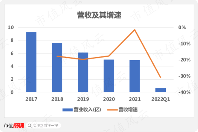 公司总营收从2017年的9.2亿一路下滑,到2021年仅为4.9亿,接近腰斩。