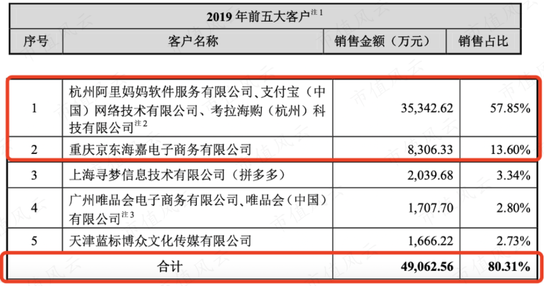 早在公司重组时回复上交所的问询函中,公司披露了2019年前五大客户名单,包括阿里、拼多多、唯品会等平台。其中,对第一大客户阿里的销售额达到3.5亿,占该年营收的57.8%。