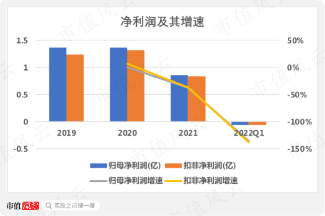2019年起公司的归母净利润也在不断下滑,到了2022年一季度仅为-600万,扣非净利润走势较为一致。