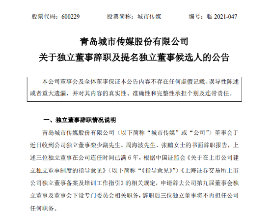 公告显示,近日城市传媒收到独立董事栾少湖、周海波、张鹏的书面辞职报告,因连任时间已满 6 年,根据中国证监会的相关规定,申请辞去公司第九届董事会独立董事及董事会下设专门委员会相关职务,辞职后三位独立董事将不再担任公司任何职务。