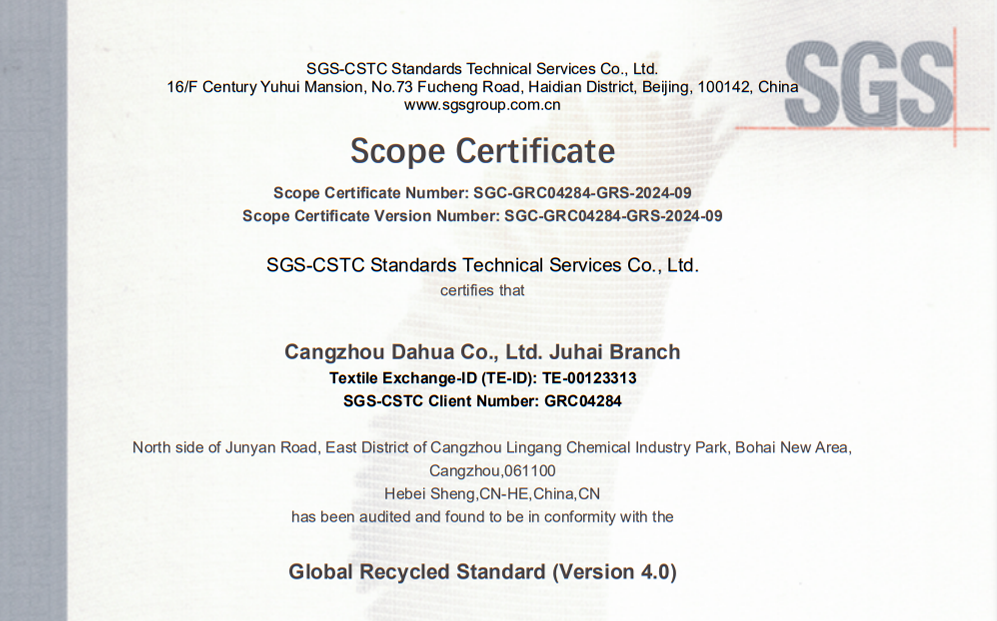 日前,沧州大化聚碳酸酯(以下简称PC)产品通过全球回收再生标准(Global Recycled Standard)-v4.0(简称GRS-v4.0)认证。