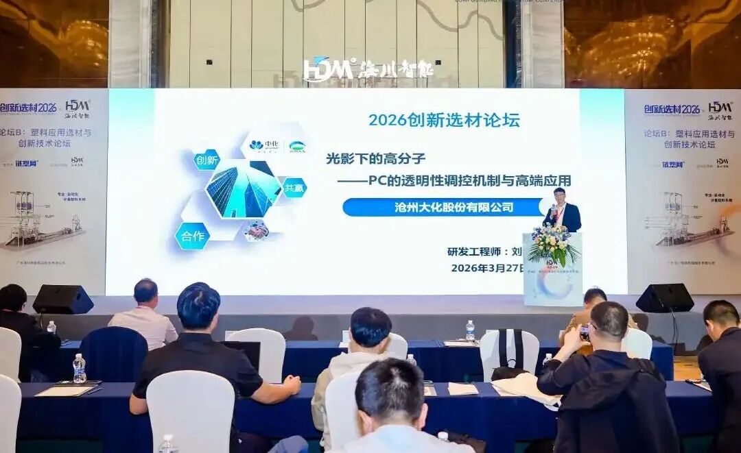 以选材创新破局材料瓶颈,以技术攻坚赋能高端制造。2026年3月26—27日,2026CIC创新选材论坛在苏州圆满举办,沧州大化受邀参会,研发工程师刘江博士作《光影下的高分子——PC的透明性调控机制与高端应用》主题报告,与400余位行业专家、产业链伙伴齐聚一堂,共话新材料发展趋势、共探选材创新路径,充分展现国企在高端化工材料领域的创新实力与责任担当。