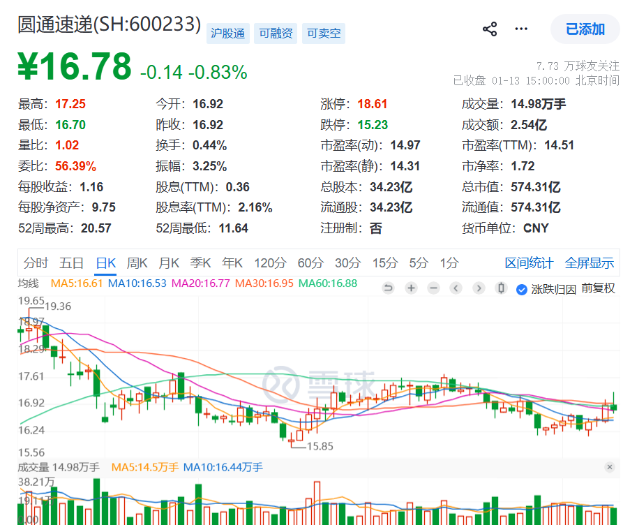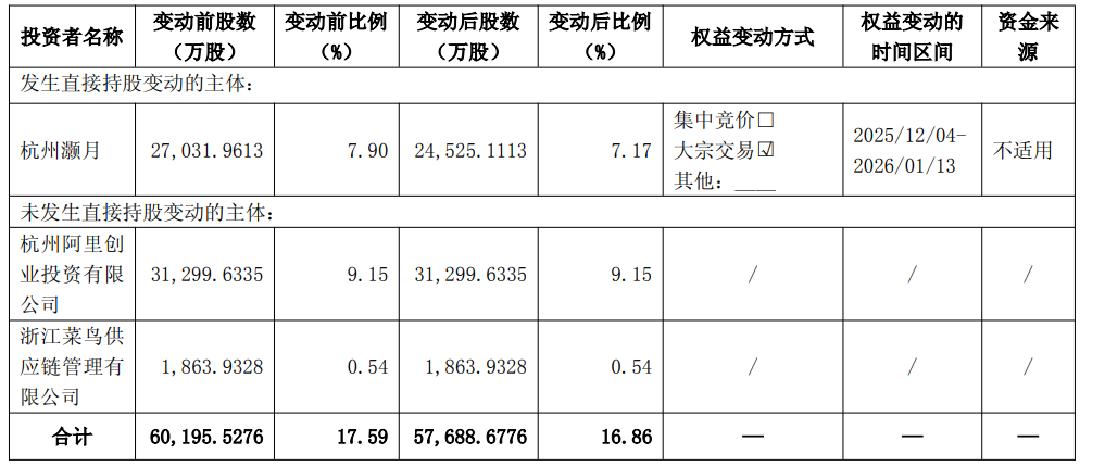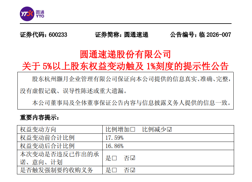 近日,圆通速递收到杭州灏月企业管理有限公司(以下简称“杭州灏月”)通知,杭州灏月在2025 年12 月4 日至2026年 1 月 13 日期间,通过大宗交易方式转让所持公司股份25,068,500 股。